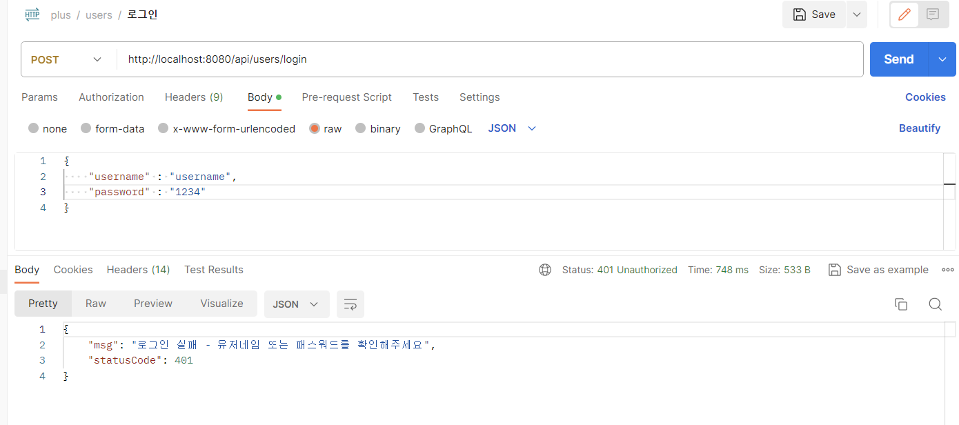 2) 로그인 실패 (username이 없거나 password가 일치하지 않는 경우)